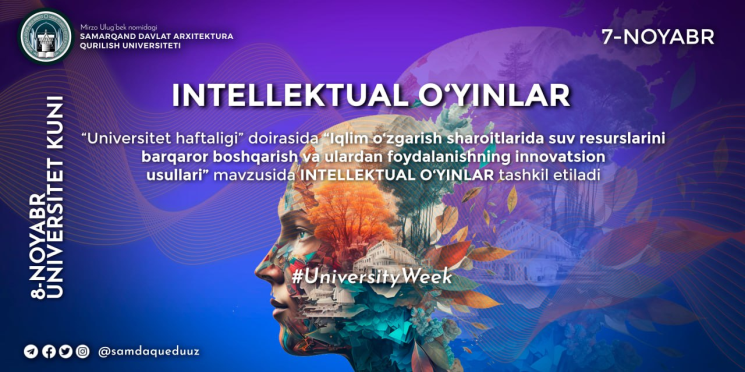 In celebration of the 2nd anniversary of Mirzo Ulugbek Samarkand State Architecture and Construction University being granted university status, an Intellectual Game was held on the theme “Innovative Methods for Sustainable Management and Use of Water Resources under Climate Change Conditions.”Student and researcher teams from various faculties participated in the competition, showcasing their knowledge and creative approaches on innovative ideas, sustainable management practices, and modern technologies for the efficient use of water resources.During the event, a quiz segment was also organized, featuring questions dedicated to water-saving technologies, water scarcity challenges, and innovative solutions aimed at promoting awareness and practical understanding of sustainable water management.