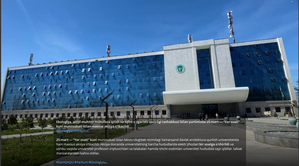 At the initiative of the Ministry of Ecology, Environmental Protection, and Climate Change, a special campaign was held across the country on March 25 — “Earth Hour” Day.In honor of “Earth Hour”, a special event was also organized at Mirzo Ulugbek Samarkand State University of Architecture and Construction.As part of the campaign, all electrical equipment on the university premises was turned off for one hour. During this time, professors, teachers, students, and staff members took a walk around the university grounds and enjoyed the beauty of nature.