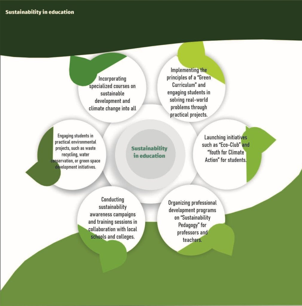 • Fostering ecological culture in university life. Promoting environmental responsibility among students and faculty, expanding green are s, ensuring waste recycling, and encouraging the rational use of resources.