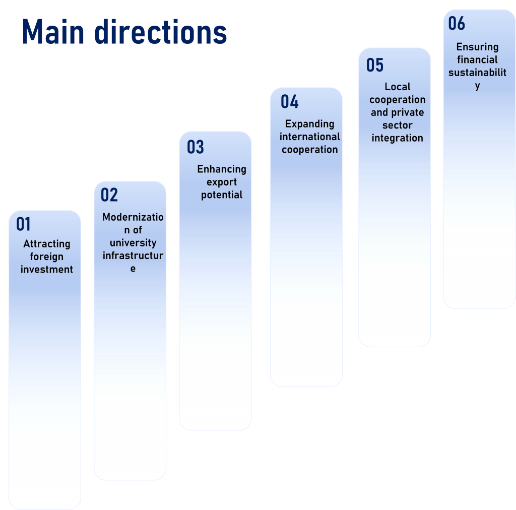 Talabalar va xodimlar uchun barqaror kampus infratuzilmasini yaratish. Xalqaro moliyaviy institutlar bilan hamkorlik orqali barqaror investitsiyalarni jalb qilish