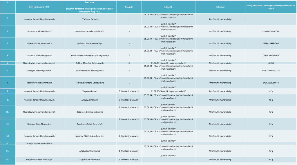 21 Mirzayev Murod Namazovich 1986 asosiy Atrof muhit muhandisligi o‘qituvchi erkak mavjud emas mavjud emas https://scholar.google.ru/citations?user=q5wKo4AAAAAJ&hl=ru22 Nodirov Dilshod Murodullayevich 1988 asosiy Atrof muhit muhandisligi o‘qituvchi erkak mavjud emas mavjud emas https://scholar.google.com/citations?user=PtQVhZAAAAAJ&hl=ru
